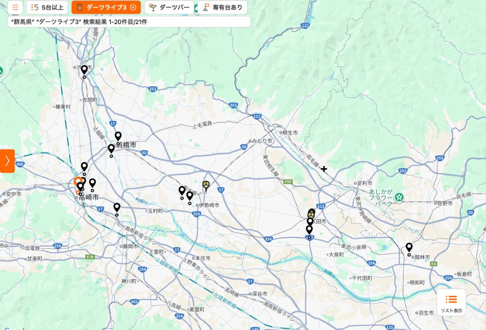 新幹線の停車駅である高崎市(8店舗)を筆頭として、太田市(6店舗)、伊勢崎市(3店舗)、県庁所在地の前橋市(2店舗)、館林市・渋川市(各1店舗)と人口の多い県央部から東部に掛けて点在しています。